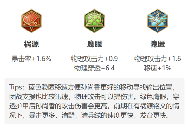 一、鷹眼銘文:此銘文能提高孫尚香的物理攻擊和穿透能力,使她在前期就能輕松應(yīng)對(duì)敵方坦克,這就像我們?cè)谏钪忻鎸?duì)困難時(shí),需要銳利的眼光去洞察問題的本質(zhì)。